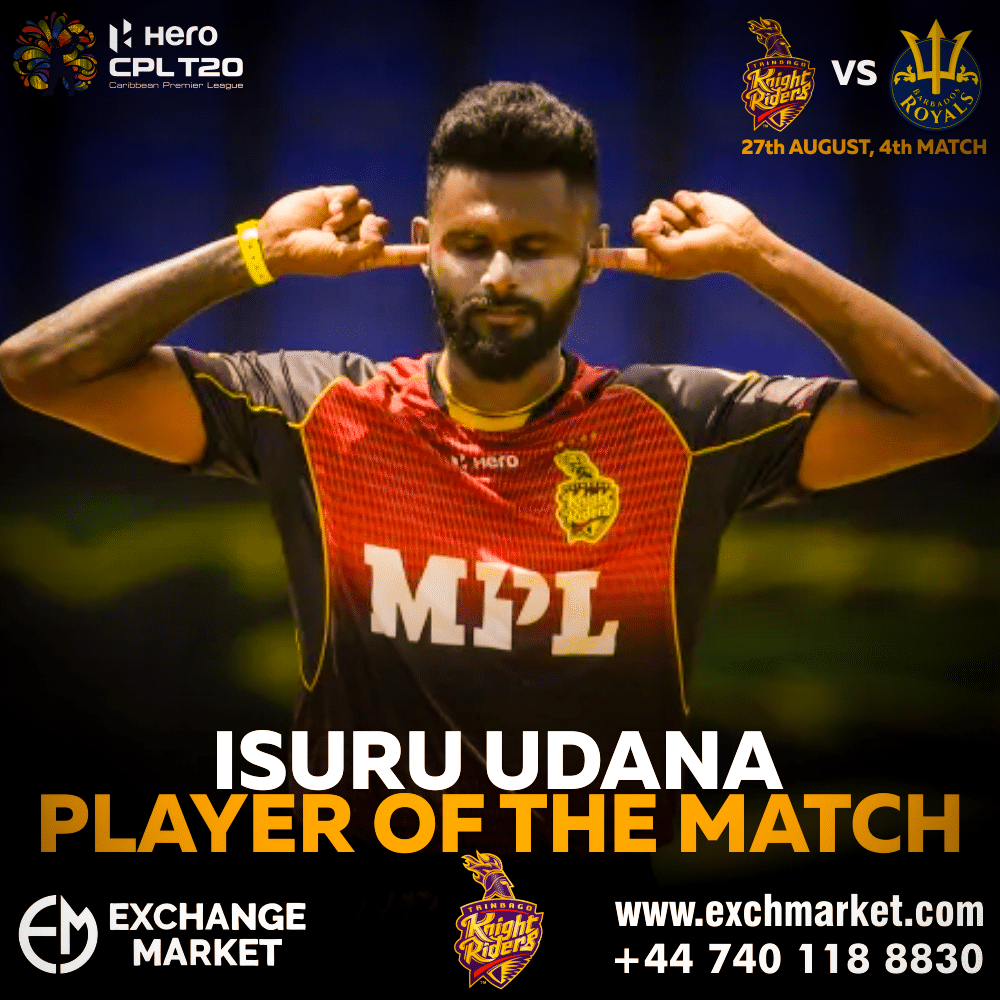 Trinbago Knight Riders defeated Barbados Royals by six wickets in the fourth match of the Caribbean Premier League (CPL 2021). Playing first, the Barbados team played first and scored 122 runs in 19.2 overs. Trinbago Knight Riders achieved this target in 16.5 overs for the loss of 4 wickets. Isuru Udana has been adjudged the Player of the Match for his lethal bowling.